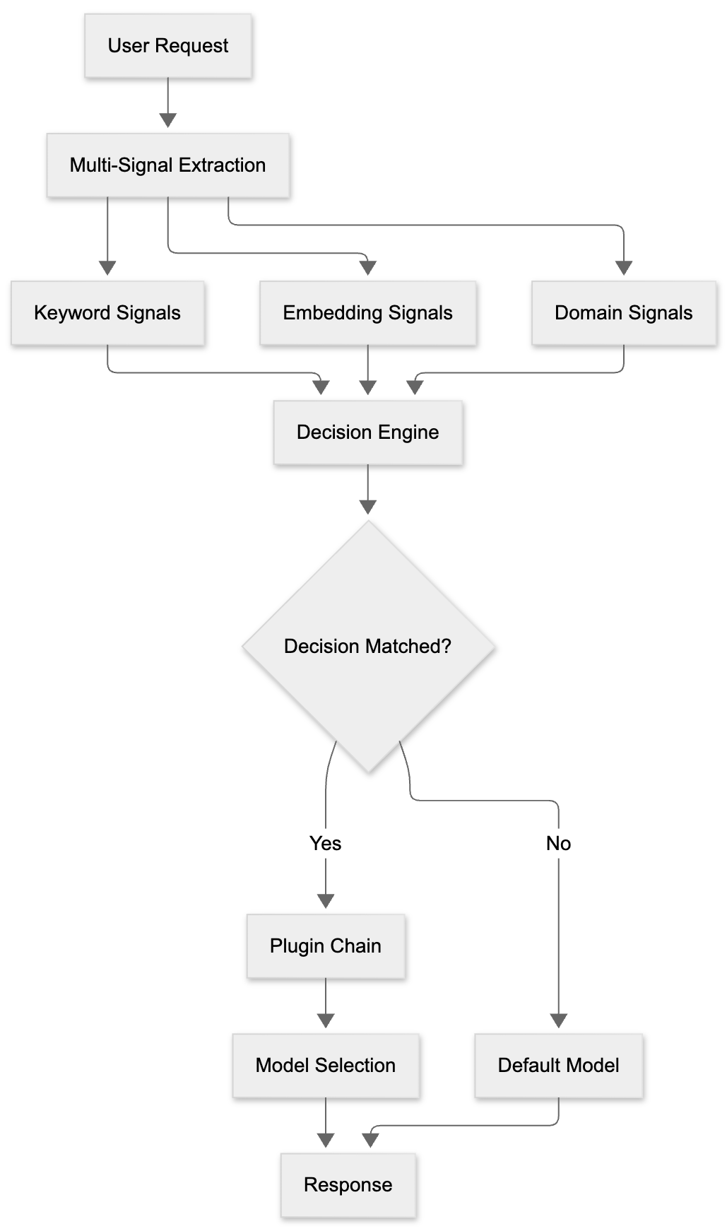 The Signal-Decision Architecture fundamentally reimagines semantic routing by separating signal extraction from routing decisions and introducing a flexible decision engine with built-in plugin orchestration.