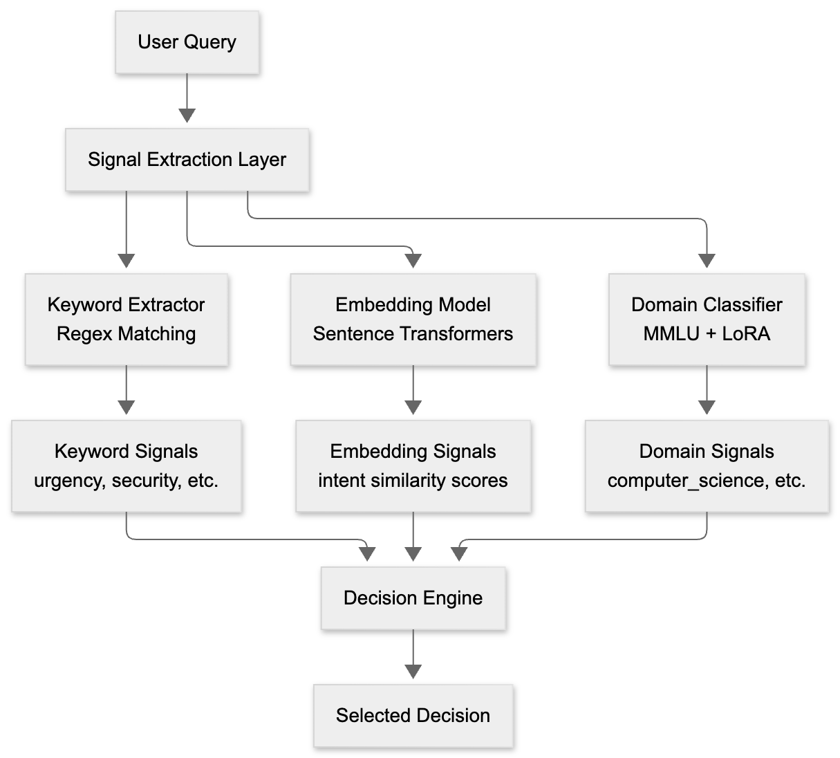 Key Advantage - Interpretability: Unlike black-box ML models, keyword signals provide complete transparency. When debugging routing decisions, you can trace exactly which keywords triggered which rules. This is critical for compliance auditing and troubleshooting production issues.